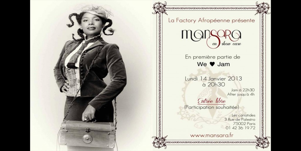 La factory afropéenne invite Mansara en show case à We ♥ Jam, le lundi 14 janvier aux Cariatides à 20h30, 3 Rue de Palestro 75002 Paris.M°Chatelet/Les Halles ou Etienne Marcel